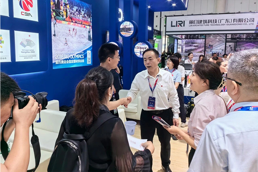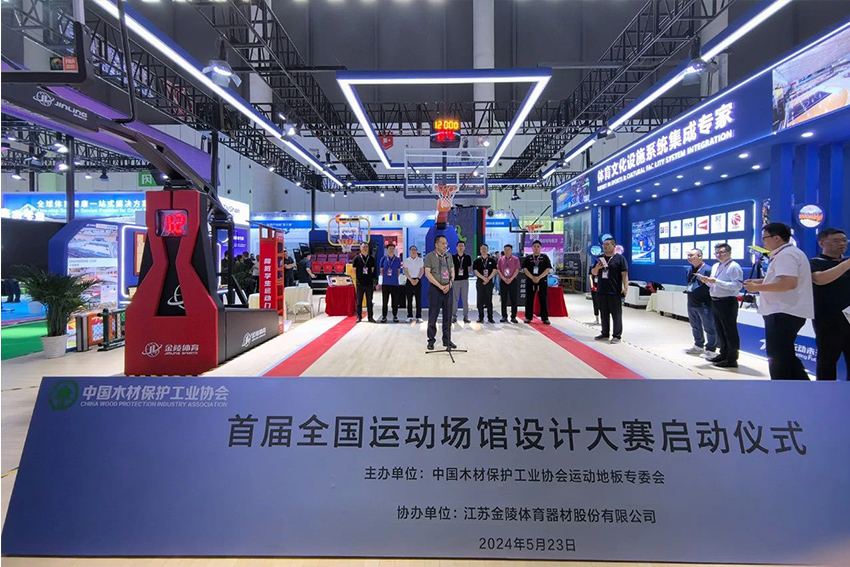 展會(huì)期間由中國(guó)木材保護(hù)工業(yè)協(xié)會(huì)運(yùn)動(dòng)地板專委會(huì)主辦的首屆全國(guó)運(yùn)動(dòng)場(chǎng)館設(shè)計(jì)大賽啟動(dòng)儀式在金陵體育展位舉行,金陵體育總經(jīng)理李劍剛出席并致詞。